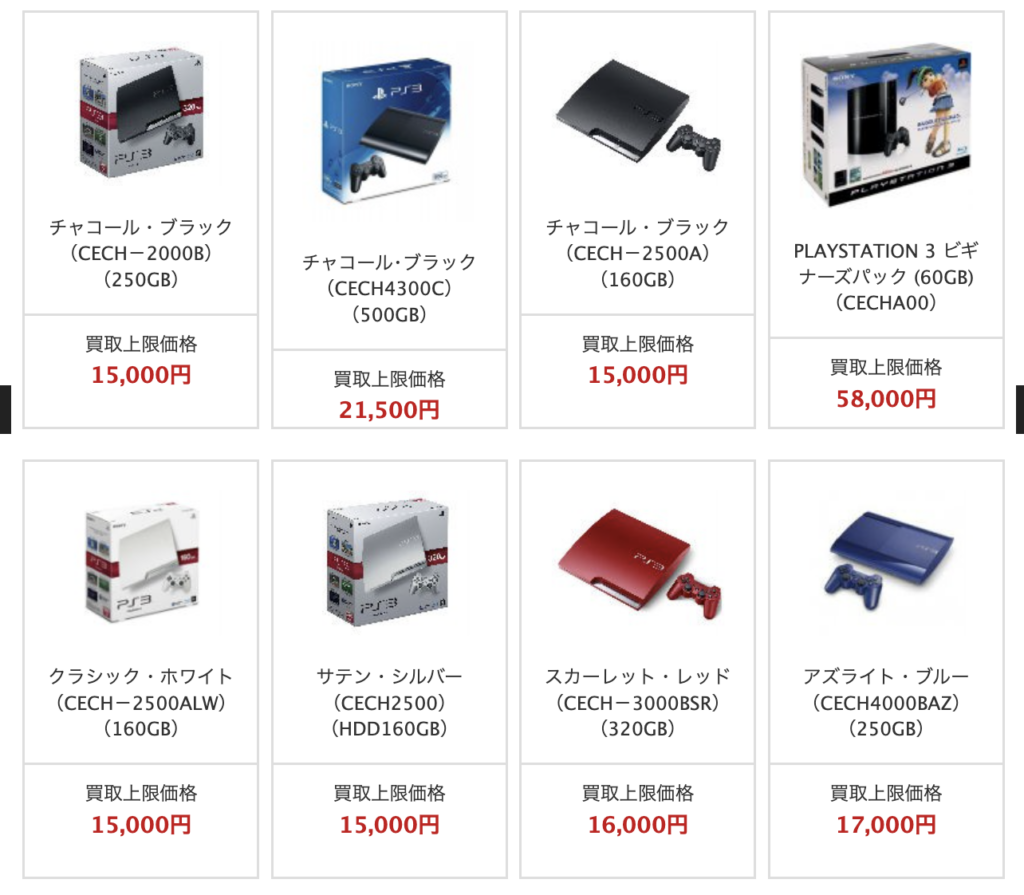 また、ゲーム買取ブラザーズは限定版やレアカラーのPS3は、以下のようにさらに買取価格が上がります。